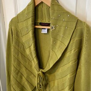 Simon Chang Olive Green Knit Cardigan Sweater Tie Closure Boho Designer Artsy