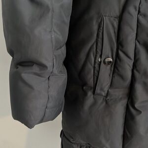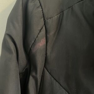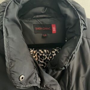 Simon Chang Puffer Jacket 3/4 length with snap buttons. Shoulder has a lipstick mark? Size L