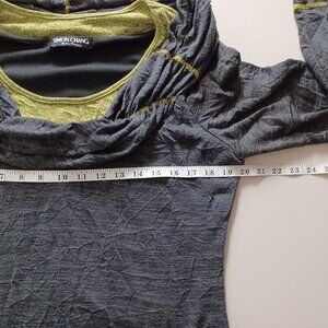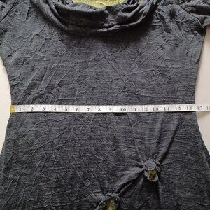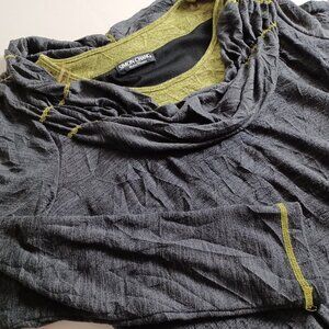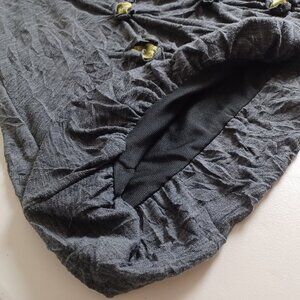 A unique dress in grey with lime yellow accents. The material has a comfortable stretch and it has a wrinkled texture giving it a whimsical charm. It’s a fit & flare design with a slightly bubbled hem that falls below the knees. Perfect for spring, fall and winter. Great condition.