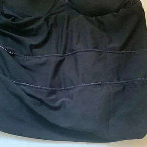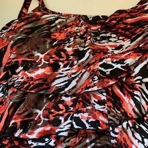 This is in excellent used condition. The band of elastic goes around the torso at the bust level providing additional comfort and fit. Cute ruffle pattern with black underneath. Very attractive piece!