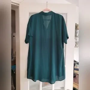 Teal button down, long enough to be a mini dress. Nice and light, perfect for warm weather. Made of 100% polyester. Length shoulder to hem is 32" with a little extra length on the back side, width is 22".