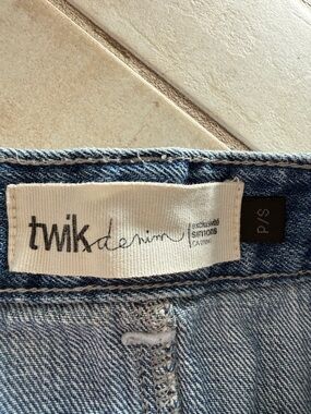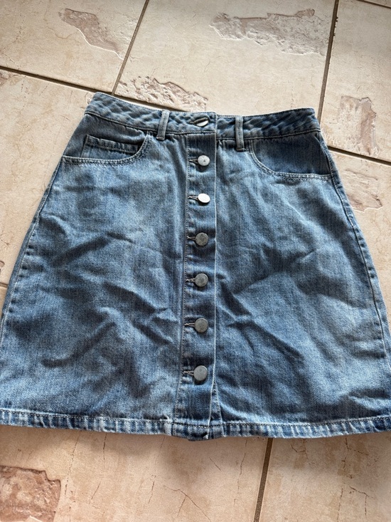 A casual blue denim mini skirt with a full button-front closure. Features front pockets and belt loops. Slight A-line shape for easy styling.
