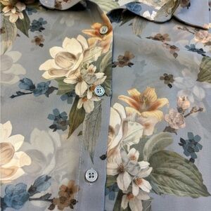 Description: Elegant floral button-down shirt. Features a blend of gray and blue tones. Perfect for casual or formal wear.