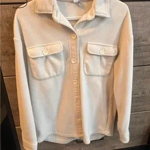 Soft cream cardigan with button-up front. Features two chest pockets. Classic collar design.