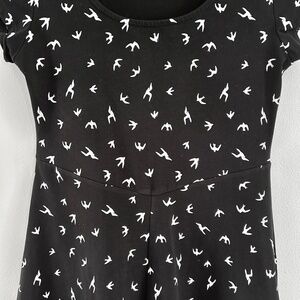 Simons brand Twik. Summer dress in black and white with swallow birds print. Short cap sleeve, fitted bodice and flared skirt.