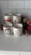 Charming holiday mugs with festive designs. Cream base with red and black accents. Perfect for seasonal beverages.