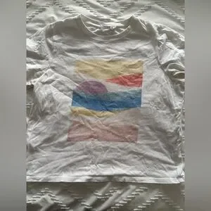 Short sleeve white tee with abstract design. Features red, yellow, blue, and purple shapes.