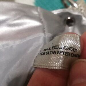 This listing is for a small silver handbag in like-new condition. It is a fairly simple soft-bodied bag with a nice finish, I think it's made of PVC. Styled with little tucks along the sides. Snap closures. The handles and details extending down from the handles add a touch of glitz, glamour, and sparkle! All metal pieces (rings, snaps) are done in silver tone to match the rest of the bag. Super clean, inside and out. Please note that there is no branding visible on the bag; the tag inside tag says it was manufactured exclusively for Glow After Dark, which is a Jennifer Lopez product, so that's how I've listed this bag.