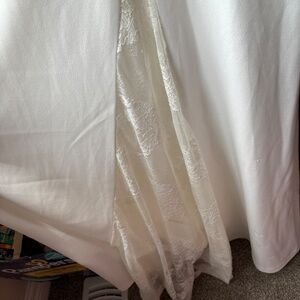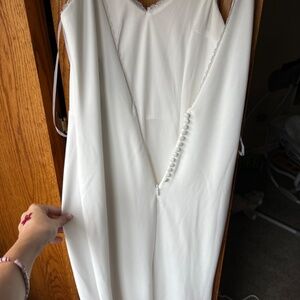 Simple wedding/reception dress. Spaghetti straps, low back with button detail. Lace detail on bottom. Never worn tags still on , small thread pulling from cat. Size xs