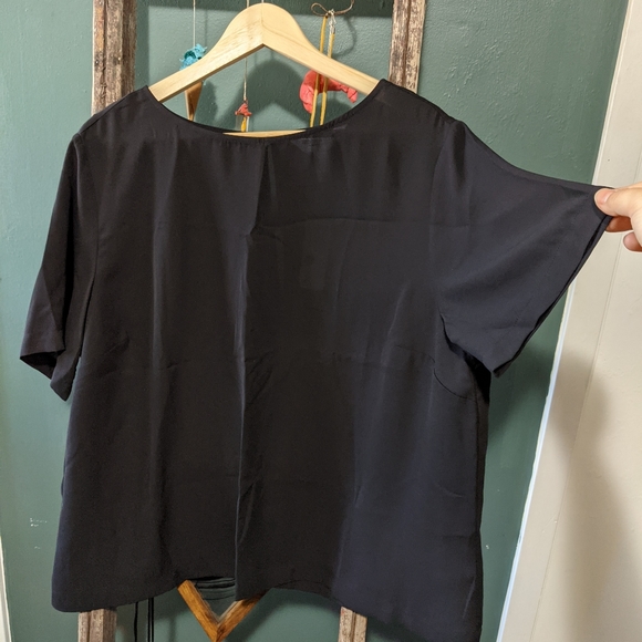 Polyester black Blouse. A great easy way to dress up some jeans. Fits small in the bust.