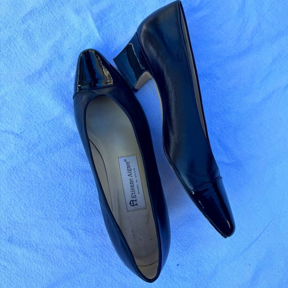 Simple black heel, leather with patent leather toe, 1 inch