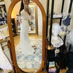 V neck chiffon and crepe wedding dress. Worn once, dry cleaned and put away. Some dirt at the rear hem, could easily be hemmed away. I’m 5’10 and wore flats. Small sweep train. Mid line embroidery is semi transparent. Fits like my favourite pyjamas. Incredibly comfortable and forgiving. Easy to sit and move. The dress was custom made for me. Measurements on request.