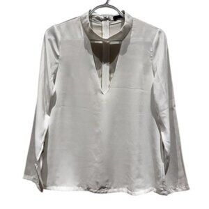 A white, long-sleeved blouse with a choker-style neckline from the brand Simplee Apparel. The blouse features a V-shaped cutout below the choker and a concealed zipper at the back. It is made of a lightweight, satin fabric, giving it a slightly shiny appearance. The sleeves are long and have a subtle flare at the cuffs. Simplee Apparel is known for its contemporary and minimalist designs, often incorporating trendy elements like the choker detail seen in this blouse.