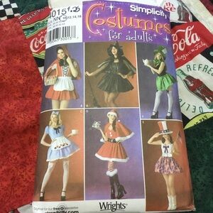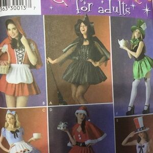 Misses Size 10, 12, 14, 16 Costume. Includes (Little Red Riding Hood) dress. hooded hood, apron; (Witch) dress, cape, and hat; (Mad Hatter) skirt, bodice, and hat; (Alice In Wonderland) dress, bow, and apron; (Mrs. Claus) dress, cape and hat; (Patriotic) skirt, bodice and Uncle Sam hat.