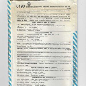 This vintage Simplicity pattern 6190 features patterns for shadow quilted Christmas ornaments (9)and circular tree skirt (171 cm diameter). It was designed by Marjorie Puckett. It is from 1983 and the pattern # seems to be an old one. The pattern pieces are still factory folded and uncut.