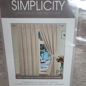 Simplicity, NWT, Chenille 4 pc Drapery Set, in its original packaging.Back tab drapes and Includes 2 tiebacks. Dimensions on the package pic.
