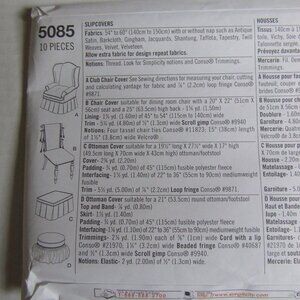 Uncut Simplicity ShowHouse sewing pattern 5085. Designed by Botsford Interiors. Printed in 2004 in the USA. Federal Victorian slipcovers. Club chair, dining chair, square and round ottoman covers. The recommended fabrics include taffeta, tapestry, and jacquards.