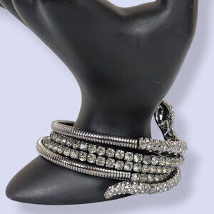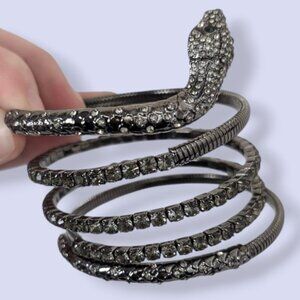 So, this bracelet is from Simply Vera by Vera Wang and is made of a dark silver tone metal. The bracelet wraps around 5 or so times like a slinky (it will adjust if your arm is bigger) and has a defined (and rhinestoned) snake head and tail. There are sections of solid metal links as well as sections of dark, square rhinestones. The interior of the bracelet is flat and smooth. I found the bracelet a little big on my wrist and more comfortable higher up on my arm (where no one really wears bracelets).