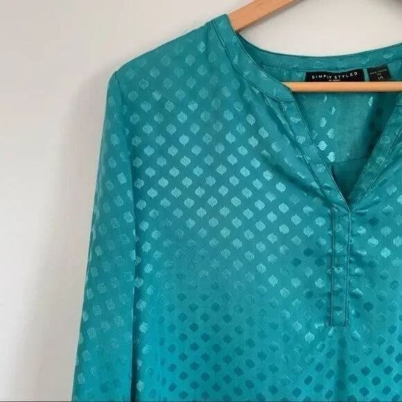 Simply styled by Sears large teal self print blouse full sleeves made in India. Collar neckline with half slit