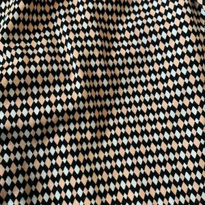 Designed in Paris, and made in Morocco, this dress has gorgeous, clean lines. Done in an attractive geometric pattern with soft, lightweight fabric. It’s a beautiful piece. Peach, white, and black.