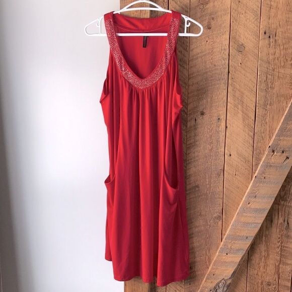 Amazing red party dress with cristals collar Loose fit 2 big pockets Stretch material See pics for measurements