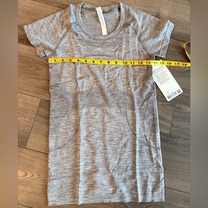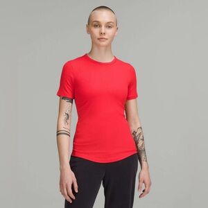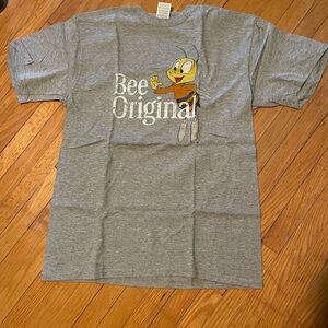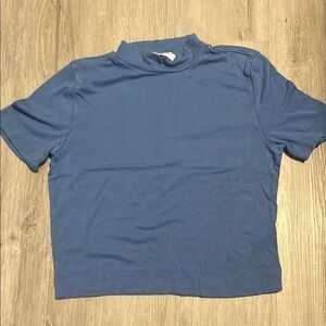 This tee is new with tags. The neck and hem are rounded.