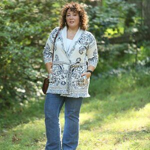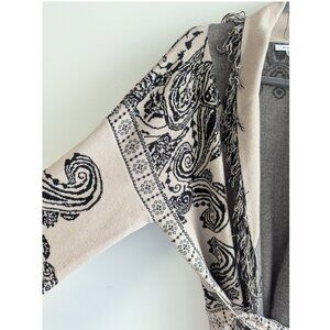 Sioni Paisley Jaquard Fringe Shawl Knit Sweater Cardigan in beige/black - Size L - In Excellent Condition!