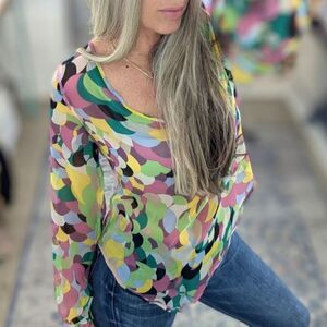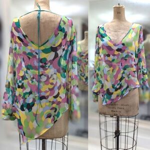 Psychedelic swirl of citrus with pink & black silk chiffon plunging V neck tunic style blouse. Semi transparent.