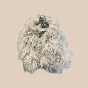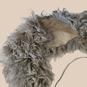 Elevate your wardrobe with the luxurious Sissi Curly Sheepskin Collar from Fine Finds Designs. Carefully crafted to be 23 inches long and 5-6 inches wide, this stunning accessory adds chic sophistication to any outfit. The collar features two extra-long leather ties in front for a versatile and elegant touch.