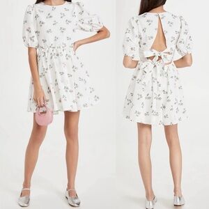 Sister Jane White Floral Embroidered Backless Baby Doll Mini Puff Sleeve Dress
