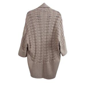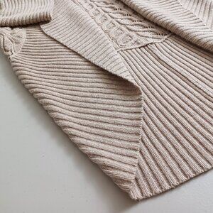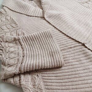 A lace knit cardigan in a neutral tan shade. Made from a mix of cotton, angora, wool, and other fibers, it's so cozy and comfortable. Perfect for spring and fall. Note: Not very noticeable but there’s a tiny bit of piling starting to form around the sleeves and trims. Overall, great condition.