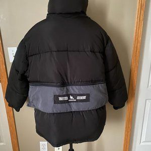 Sisters and Seekers oversized black puffer jacket. The logo is located at the back of the jacket with a pocket. Has a funnel neckline with a detachable hood. The puffer is mid-thigh length.
