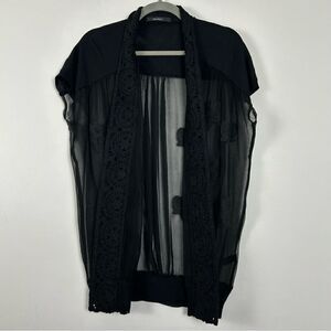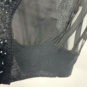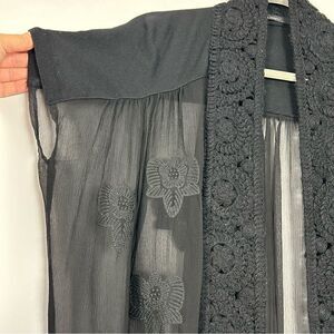 Open cardigan with beautiful combination of crochet, silk chiffon, embroidery and knitting.