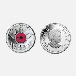 In 2004, the Royal Canadian Mint issued the 25-cent Poppy coin, the worlds first coloured circulation coin. The red poppy stamped on the reverse with pressurized ink had an innovative fluorescent security coating and quickly became a collector's item. Almost thirty million coins went into circulation in October, 2004. At the Mint Directors' Conference (MDC) in Paris, France, the 2004 coloured poppy coin was named the Most Innovative Circulation Coin.