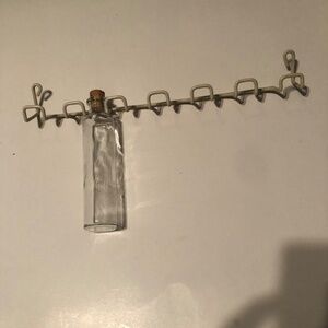 Six interesting spice bottles and holder to hang on your kitchen wall- new These glass pretties are spice bottles to pop your treasure spices in and hang on the wall. Sort of looks like something a mad scientist might hide. Who knows, maybe you will put shots in them and sip away at them while you cook dinner. The sky is the limit withe these pretties.