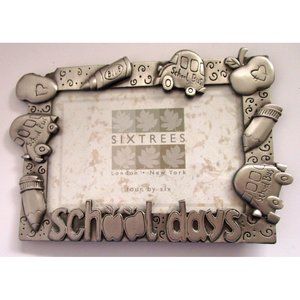 * Display your cherished school memories in style with the Sixtrees London/New York "School Days" Picture Frame. Made of ornate silver metal, this rectangular frame features a school related items pattern and clear glass.