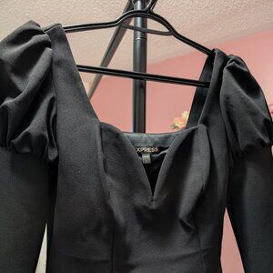 This is a cute black mini dress from Express. It features stylish puff sleeves and a flattering neckline. The dress is a size 0. Originally bought for $98 + tax.