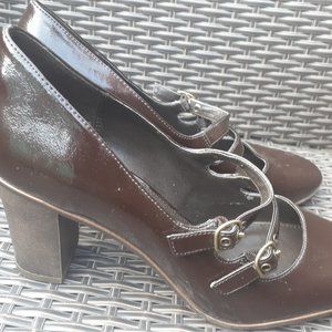 Very feminine, elegant and comfortable brown glossy square heals shoes with 2 fine buckles. size 10 US.