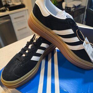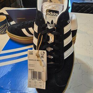 The product is a women's adidas Gazelle Bold sneaker in size 10, featuring a solid black color with accents of logo detailing. This low-top shoe has a lace-up closure and a round toe shape, perfect for casual occasions. Made with suede upper material and a rubber outsole, it offers comfort and is suitable for walking activities. The brand adidas ensures quality and style, making it a versatile choice for all seasons.