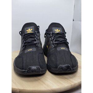 The adidas NMD R1 V2 Black Solar Gold Boost Shoes in size 10 are a stylish and comfortable pair of running sneakers for men. These lace-up shoes feature a rubber outsole and a Boost cushioned footbed, making them perfect for casual wear in the spring, summer, or fall. The black color with gold accents and solid pattern give these sneakers a modern and sporty look, while the low top shoe shaft style adds to the overall comfort and athletic vibe of the shoe. Made with textile upper material and designed in 2021, these adidas NMD R1 V2 shoes are a great addition to any athleisure wardrobe.