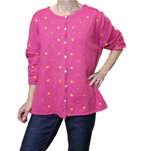 Size 1X Cardigan Knit embroidered Pink color with orange polka dot WHIMSY