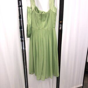 Beautiful Apple, Fern Green, Pistachio Bridesmaid/ Mother of the Bride / Groom by After Six for Dessy. It is beautifully tailored with an elegant neckline and gorgeous quality fabric with super flattering ruching.This gown is absolutely stunning. Very elegant! :) Please see size chart for measurements. These gowns don't have stretch and always need alterations for fit; the straps in particular and busts of these dresses typically need altering, as they are made for very tall, large breasted women and usually need hemming. Bridal sizing runs VERY SMALL compared to mall clothing or regular sizing. This dress is a designer size 6, but more like a "regular" or "real life" size 2 or 4 (which is why I put size 2). Comes with re-moveable belt