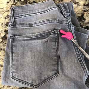* “Pinch” mark in fabric near belt loop and Small pin hole back left pocket top corner, also shown in photos with pointers