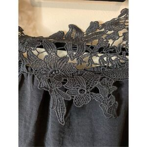 Unbranded pretty black blouse with lace detail in the front and elastic smoking in the back for comfort fit, and stretch.