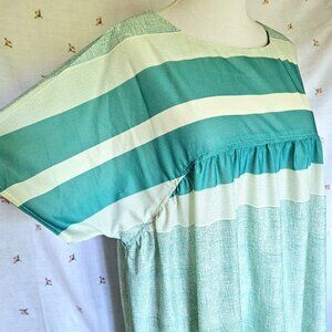 Plus size maxi length loose fitting dress in a green and light cream vintage polyester fabric, semi-sheer. Short kimono style sleeves, gathered to yoke at bustline.