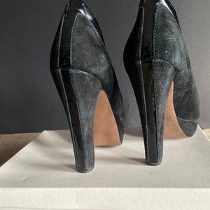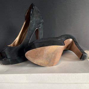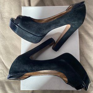 Gorgeous heel worn twice to weddings. Very comfy. Black suede with patent detailing, Very minor scuffing. Will go with any outfit, also fit for professional wear.