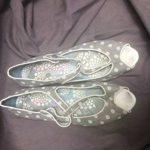 If you know the brand, you know they arent cheap! lol. These are a canvass material- greyish tan maybe? With white pola dots- soooo cute! White kitten heel capped with black. Elastic stretch hidden behind the detail button on the strap. Sliding Mary Jane strap for comfort while walking. Small ding on the back heel of the left shoe. The insoles are a bit worn- and the toes have some discoloring that may disappear with shoe polish?!