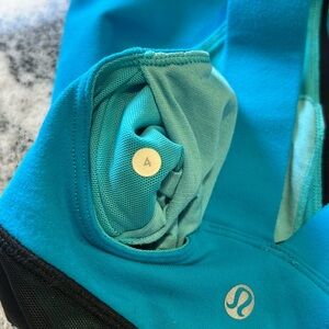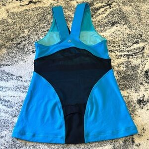 Size 4 Lululemon with built-in bra No pads, but Lululemon will replace them if you ask. There is slight pilling, but very minimal.