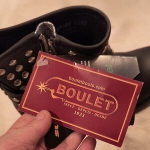 Boulet Stylish black leather ankle boots with silver studs and buckle detail.