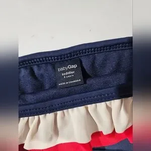 Charming navy blue bikini with playful red and white ruffles. Ideal for a fun beach day.